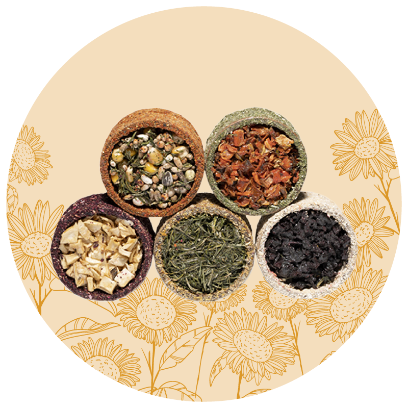 - Se pueden proporcionar cantidades limitadas de granos, verduras, frutas, premios y heno diariamente, pero no deben exceder el 10 % del total de su dieta.