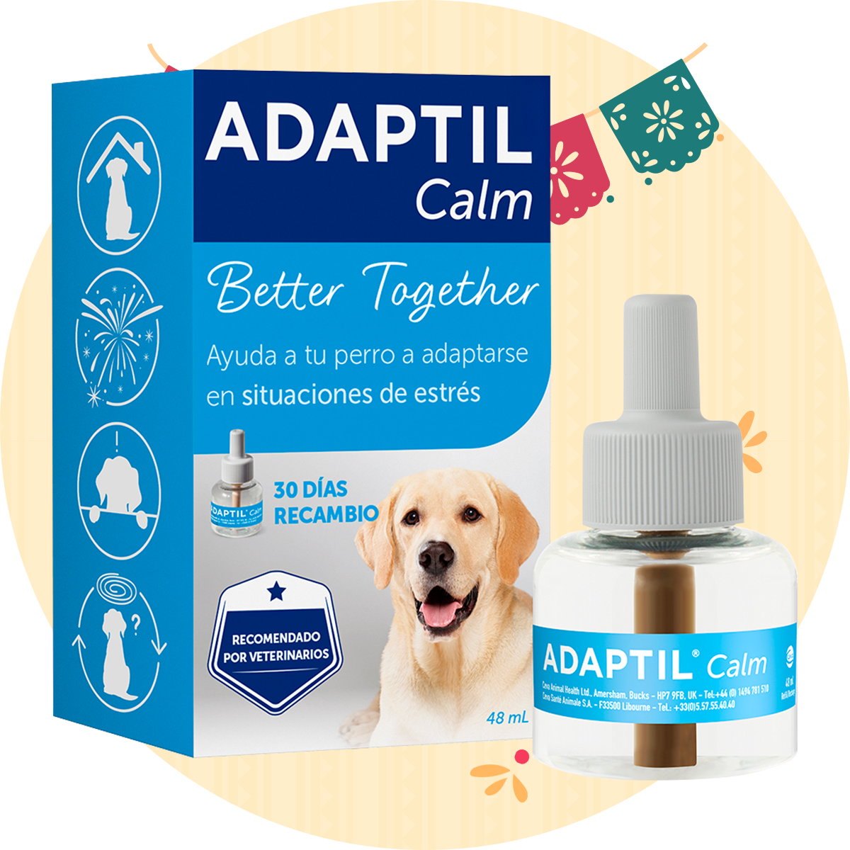 Los productos de relajación, como la camisa Thundershirt, productos de feromonas, como Adaptil o Feliway, puede ayudar a relajar y calmar a tu mascota.